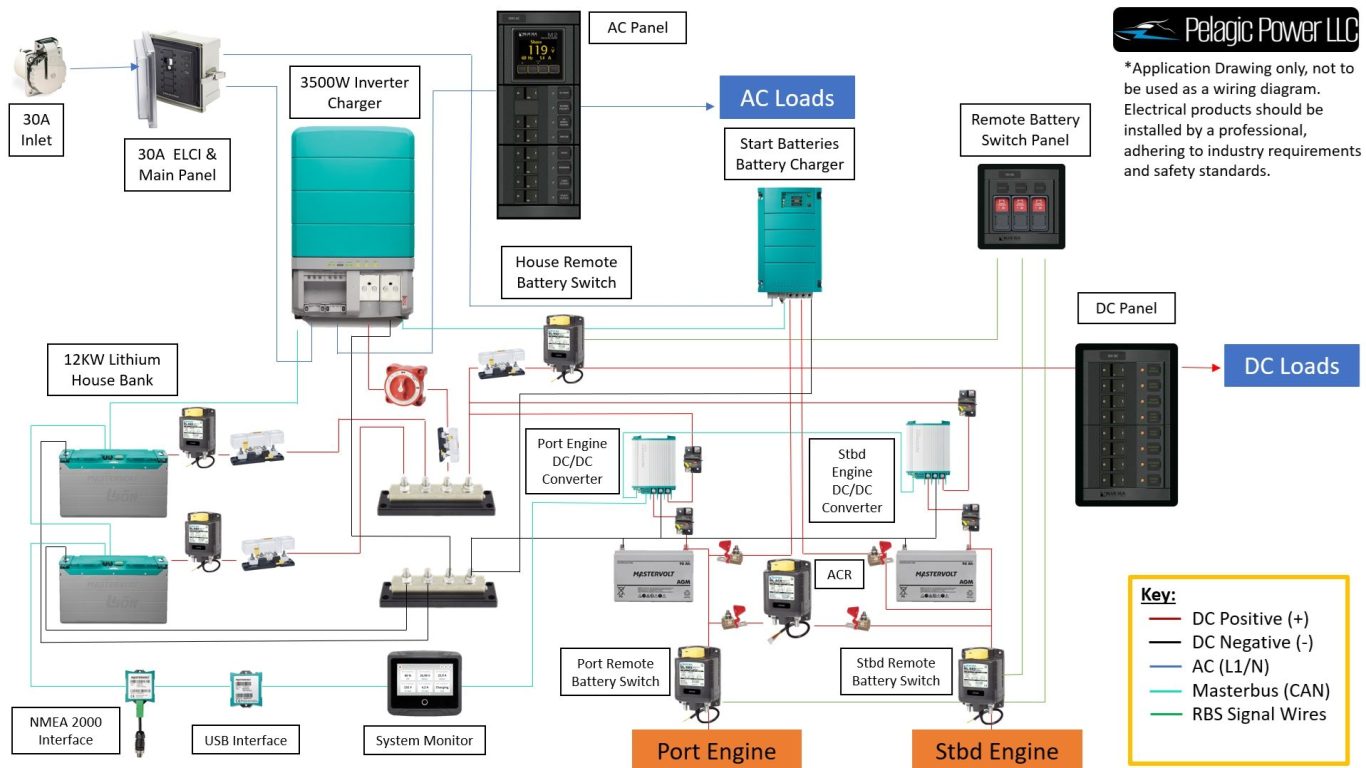 This system allows you to upgrade your house battery bank to lithium while keeping everything related to your engines the same. That way you get the benefit of a deep discharging house bank, larger inverter to feed your AC devices, all while keeping your engine, alternators, and engine batteries the same.